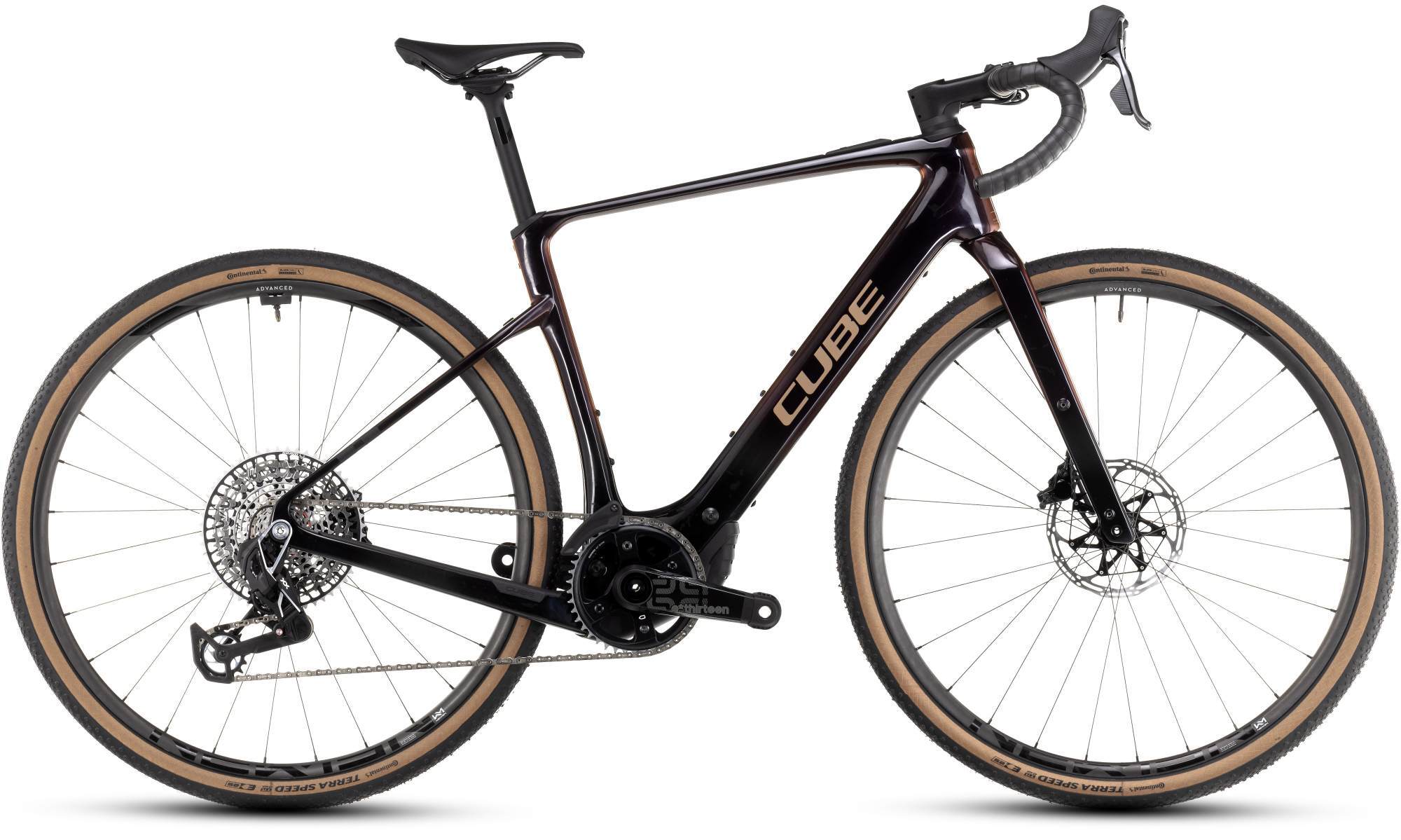 | Style | Details matter. We know that. It's reason that the Nuroad Hybrid C:62 SLT features Continental Terra Speed 45mm tyres and Newmen Advanced SL X.R.25 carbon wheels because low rolling weight and exceptional grip are differences you can feel. But the big picture matters too and that's why we built the C:62® carbon frame around Bosch's new lightweight SX drive system and 400Wh battery. With up to 55Nm of torque lighter weight and the flexibility to add a PowerMore 250Wh booster battery it's got the performance you need. Sram's XX/XX SL Eagle Transmission 12-speed gears combine toughness with exceptional electronic shifting accuracy. And Sram Force AXS hydraulic disc brakes ensure you can always slow and stop safely whatever the conditions. We took care of it all so you can just ride... Form meets function in the elegant shape of the Nuroad Hybrid C:62's carbon frame. Sure it's a great looker with a clean profile and organic curves. But we haven't forgotten practicality like incorporating clearance for tyres up to 50mm even with mudguards fitted. Or carrier mounting points at the rear and on the full carbon fork for maximum bikepacking versatility. The Bosch drive system's control unit is incorporated into the top tube with a mini handlebar remote and the frame is PowerMore-ready for a +250Wh battery booster pack. The seat clamp is hidden there's a direct mount lightweight chain guide a flat mount kickstand interface Boost rear end and UDH derailleur hanger. We reckon we've ticked all the boxes. Over to you... Frame: C:62® Advanced Twin Mold Gravel Endurance Geometry Advanced Internal Cable Routing Flat Mount Disc Fender/Rack & Kickstand Option Boost 148 UDHTM Fully Integrated Battery Fork: CUBE C:62® Technology 1 1/2" - 1 1/2" Tapered Flat Mount Disc Fender & Lowrider Mounts 12x100mm Headset: ACROS Top Integrated 1 1/2" w/ Advanced Integrated Cable Routing Bottom Integrated 1 1/2" Stem: CUBE CIS Stem w/ Cable Routing Handlebar: Easton EC70 AX Gravel Carbon Handlebar tape: ACID Bartape CC 2.5 Rear derailleur: Sram XX SL Eagle AXSTM Transmission 12-Speed Chain guide: Reverse Flip-Guide E-Chain Guide Direct Mount I-Plate Shifters: Sram Force eTap AXSTM Brake system: Sram Force eTap AXSTM (180/180) Crankset: e*thirteen e*spec Race Carbon Crank 42T Crankset chainring sizes: 42T Cassette: Sram XS-1297 10-52T Number of gears: 12 Chain: Sram XX EagleTM Transmission Wheelset (system wheels): Newmen Advanced SL X.R.25 Carbon Tires: Conti Terra Speed ProTection 45-622 Saddle: ACID Nuance SLT Carbon Seat post: Newmen Advanced Carbon 27.2mm Seat post = dropper Yes/No: NO Engine: Bosch Drive Unit Performance SX (55Nm) Cruise (250 Watt) Smart System Battery: Bosch CompactTube 400 Charger: Bosch 4A Remote: Bosch System Control incl. Mini Remote |