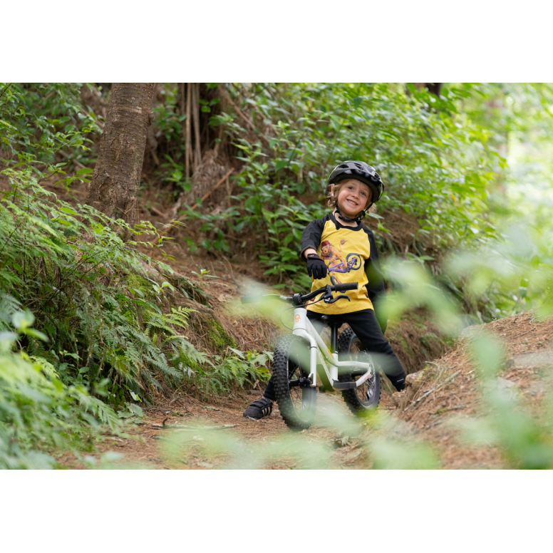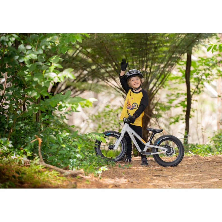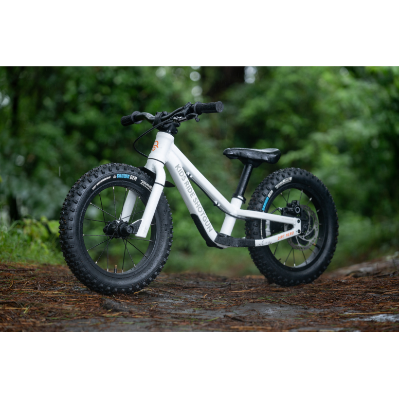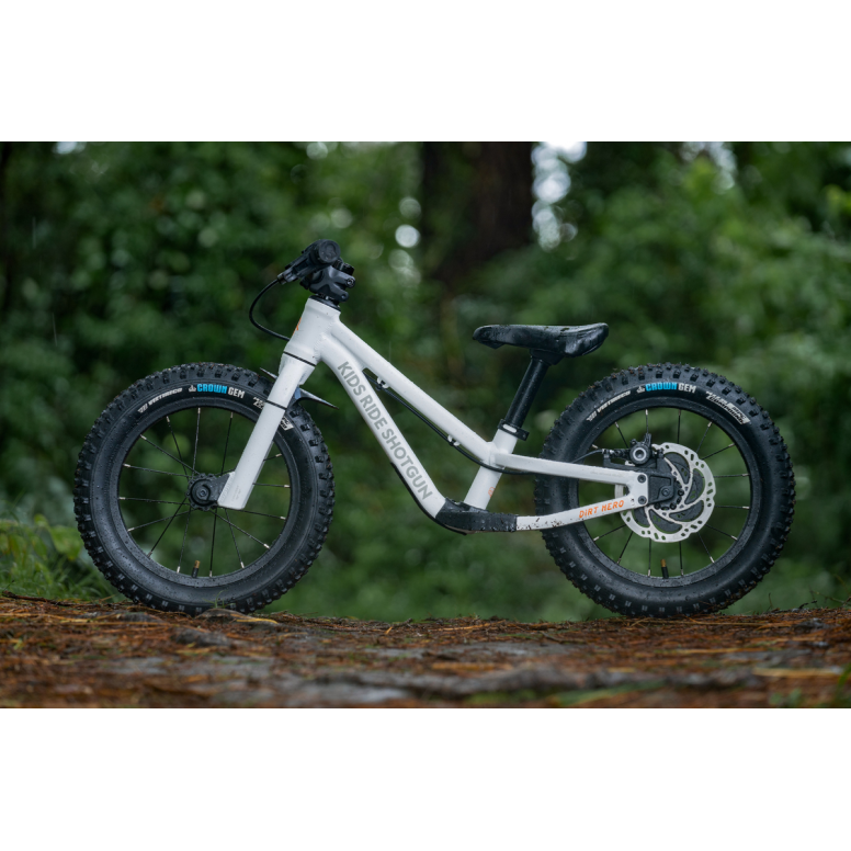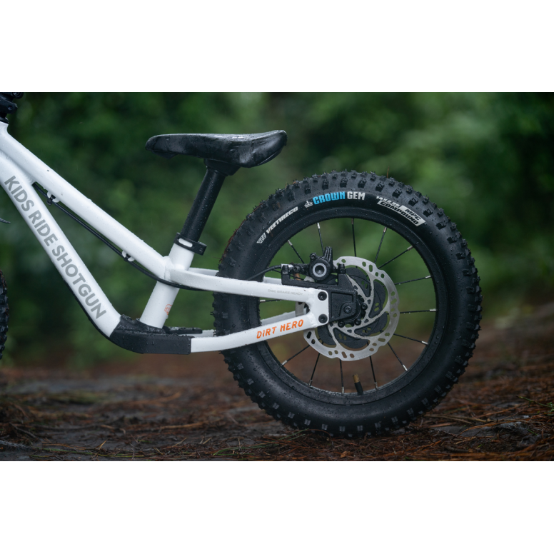 | Style | Our Dirt Hero balance bike is designed specifically for MTB kids who want to take it to the trails. A stacked feature set including 12 - 14â€A? wheel convertibility, 2.25â€A? Vee Tire Crown Gem off-road tyres, mtb geometry and Magura rear hydraulic disc brake inspires confidence and progression in mini mountain bikers who want to get off the driveway and onto the dirt. Each bike comes with 3 Shred Til Bed MTB top tube skins, for your little one to make the bike their own.