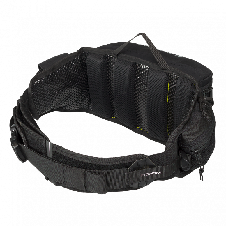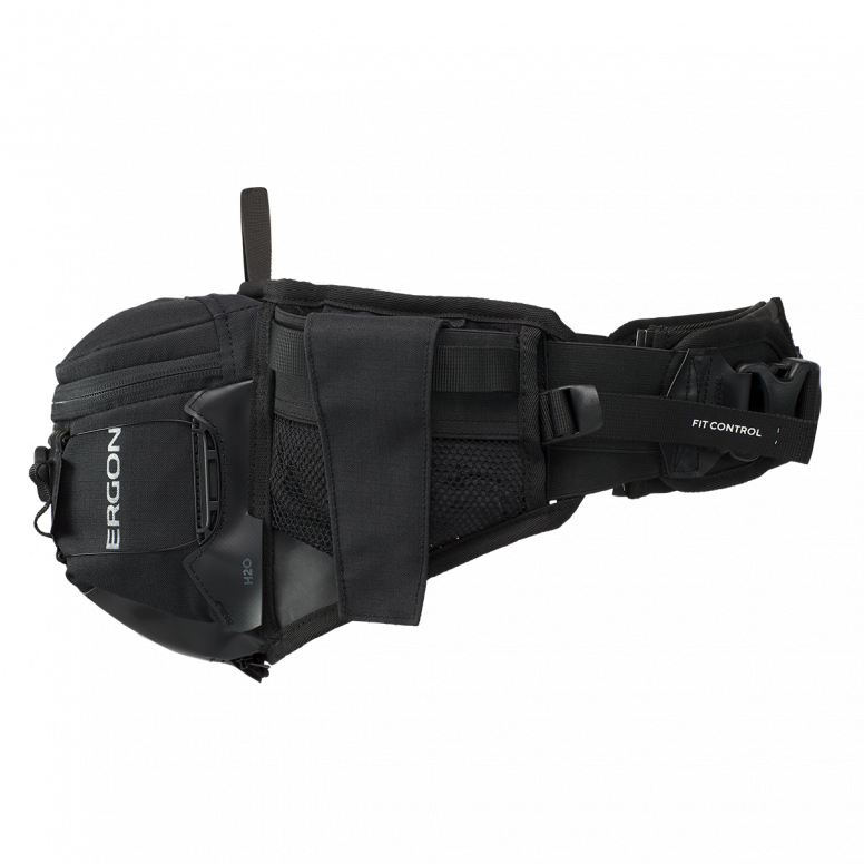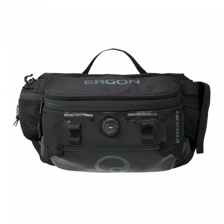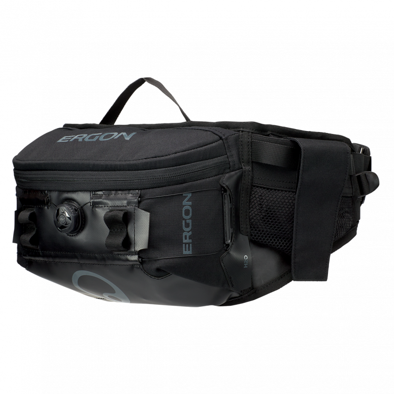 Perfect fit, maximum wearing comfort, unique adjustment mechanism: Ergon's first Hip Pack for Enduro, All-Mountain and Gravel is based on the experience of many years of backpack ergonomics. Conventional hip pockets tend to slip due to the missing back part, especially in technical terrain. Not so with Ergon: The wide, slip-resistant hip belt and the unique compression system guarantee a stable fit. Particularly innovative: The bag contents can be compactly compressed with just one hand via a screw cap. Important things such as tools, bars, hoses, smartphones or even a drinking bladder are safely stowed away and can hardly be felt.