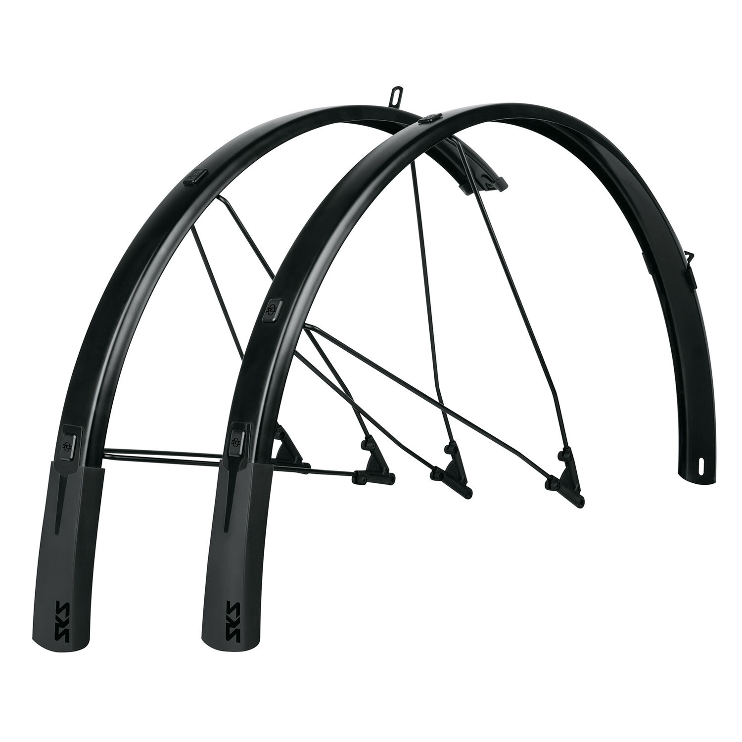 | Description | SKS: Mudguard set with a flexible spoiler It couldn't be longer: The BLUEMELS STYLE mudguard set with a flexible spoiler offers excellent all-round protection against spray water. Thanks to the flexible sandwich construction, in which ultra-fine aluminium strips are embedded in a plastic coating, the mudguard is extremely robust, rigid and corrosion-resistant. New V-adapter with ESC safety system With its matte black surface and black fastening components, the BLUEMELS STYLE also leaves nothing to be desired in terms of appearance. The newly developed V-adapter with ESC safety system uncouples the double U-stays should branches become trapped between the spokes, so the wheel is unable to jam. Includes accessories and stays. BLUEMELS STYLE 28″ 46 SET