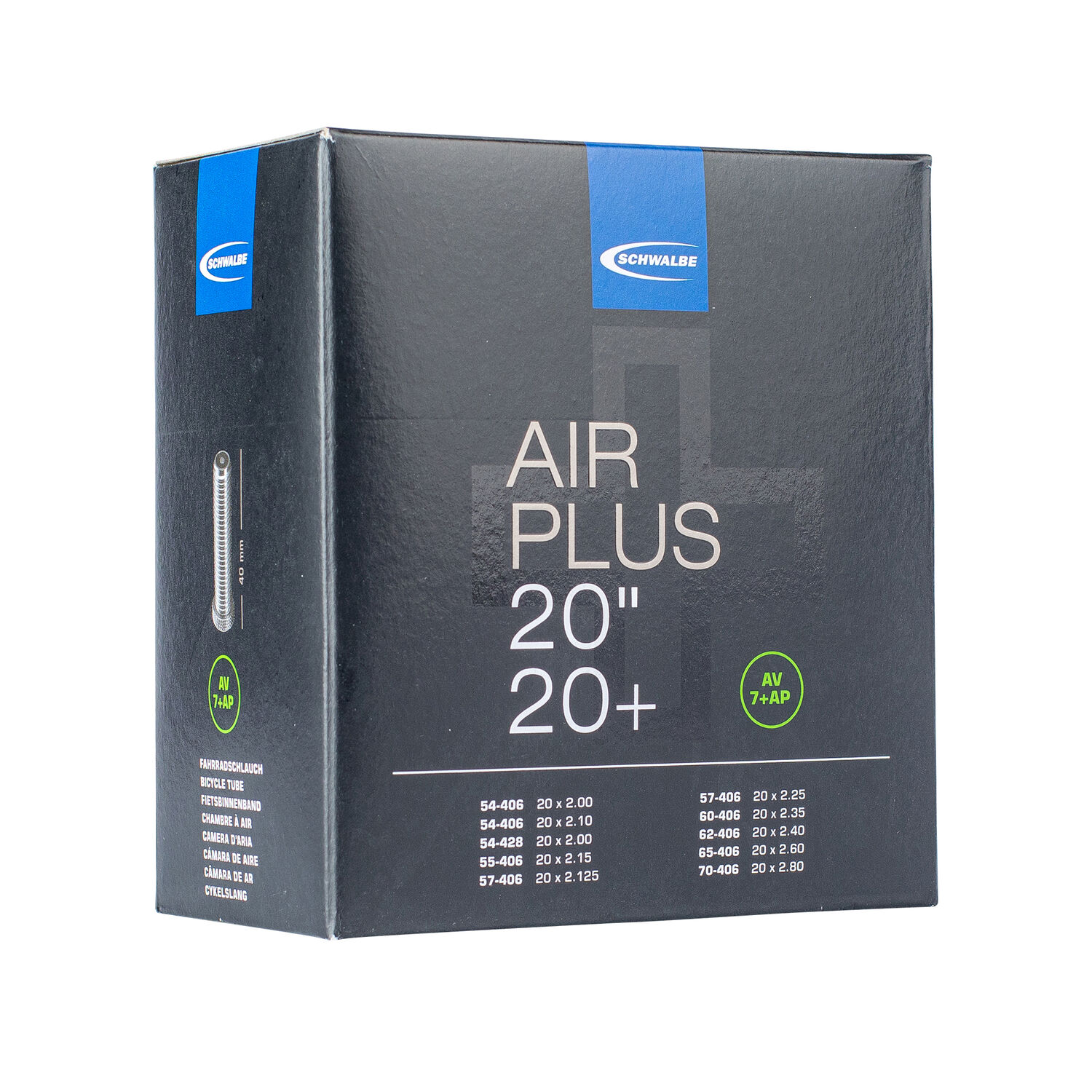 | Description | Schwalbe Air Plus - The tube that truly holds its breath.The Schwalbe Air Plus tube retains air significantly longer than conventional bicycle tubes due to its high proportion of pure butyl rubber. Therefore you have to inflate less often.With around 70% greater wall thickness it is particularly robust, so it's well protected against pinch and penetrating punctures. And if you do ever need to replace it the tube is 100% recyclable.• Tyre size: 20 x 2.10-2.80• Valve type: AV 7+AP• Valve length: 40mm |